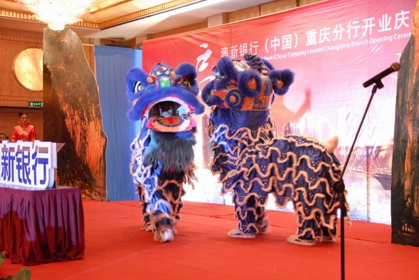 庆典中两只欢快的狮子上台祝贺,黄市长和邵明高为狮子点睛,预示澳新重庆从此将在巴渝大地大展宏图。