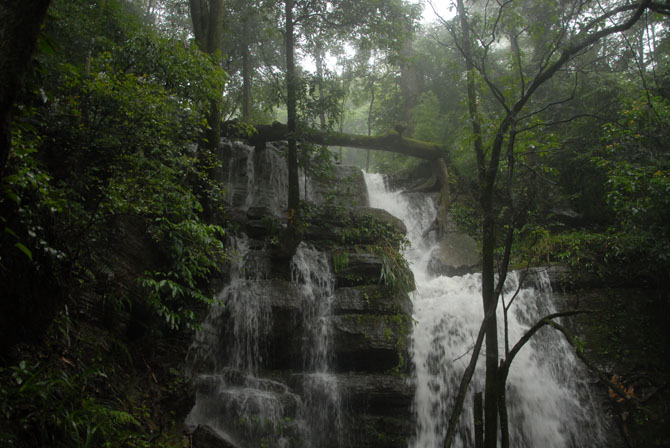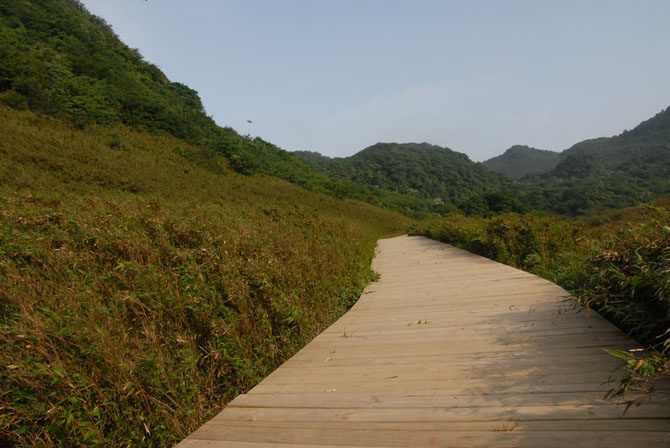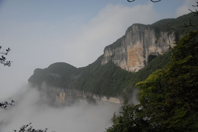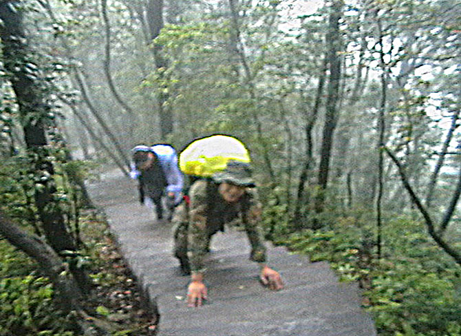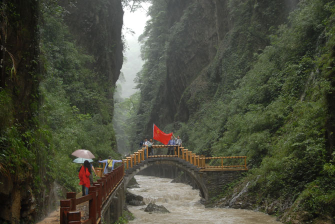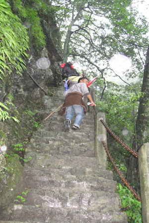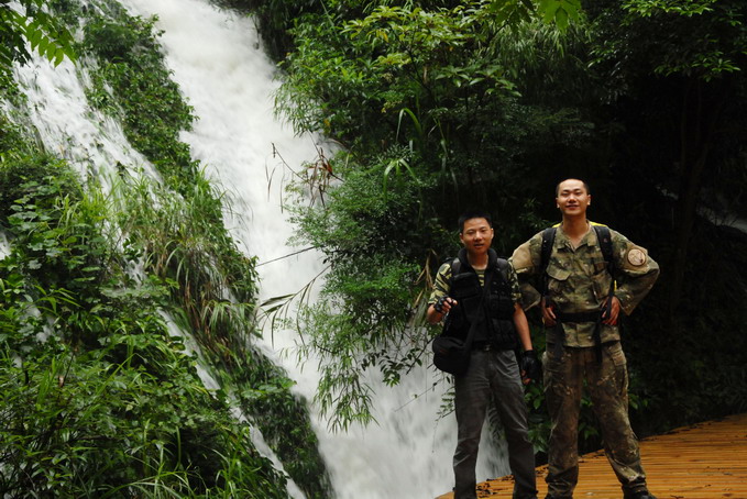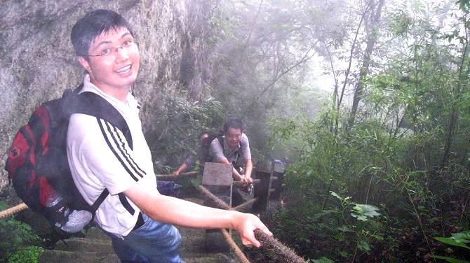 山路随着一条叫“一线天”的河流盘旋而上,因为昨晚的持续的大雨,河水暴涨了一米左右。前半段的山路相对来说比较缓和,大家一边搞怪的摆着各种POSE一边用相机记录沿途的风景。11点,经过短暂休整,队伍继续前行。随着海拔的升高,山势也越来越陡,多数的石梯坡度都超过了50度。不过大家都毫不畏惧,咬紧牙关继续前行。截至下午4点,最后一个队员顺利到达山顶平台,终于将金佛山踩在脚下。